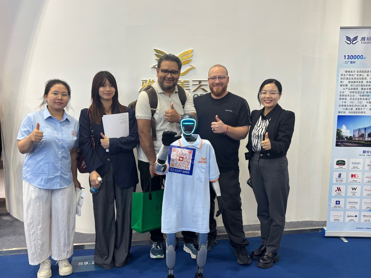 在雅格美天的展位前,人潮涌动,热度空前。两台智能机器人化身“智能导购”,成为全场最吸睛的“明星员工”。它们在现场灵活穿梭、精准演示,流畅丝滑的操作动作与满满的未来科技感,瞬间吸引了大批国内外采购商驻足围观、拍照打卡。